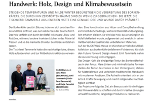 Nell’edizione di aprile 2025 della rivista LVH Manufakt si parla della vittoria del Premio Federale alla Fiera Internazionale dell’Artigianato di Monaco. L’articolo sottolinea che Emil Tammerle è stato premiato per la sua lavorazione innovativa e sostenibile del legno con la sedia M5 realizzata in legno di bostrico.