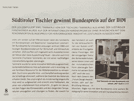 Die Dolomiten berichten über Emil Tammerle von der Tischlerei Tammerle, der auf der Internationalen Handwerksmesse in München mit dem renommierten Bundespreis für hervorragende innovative Leistungen ausgezeichnet wurde.